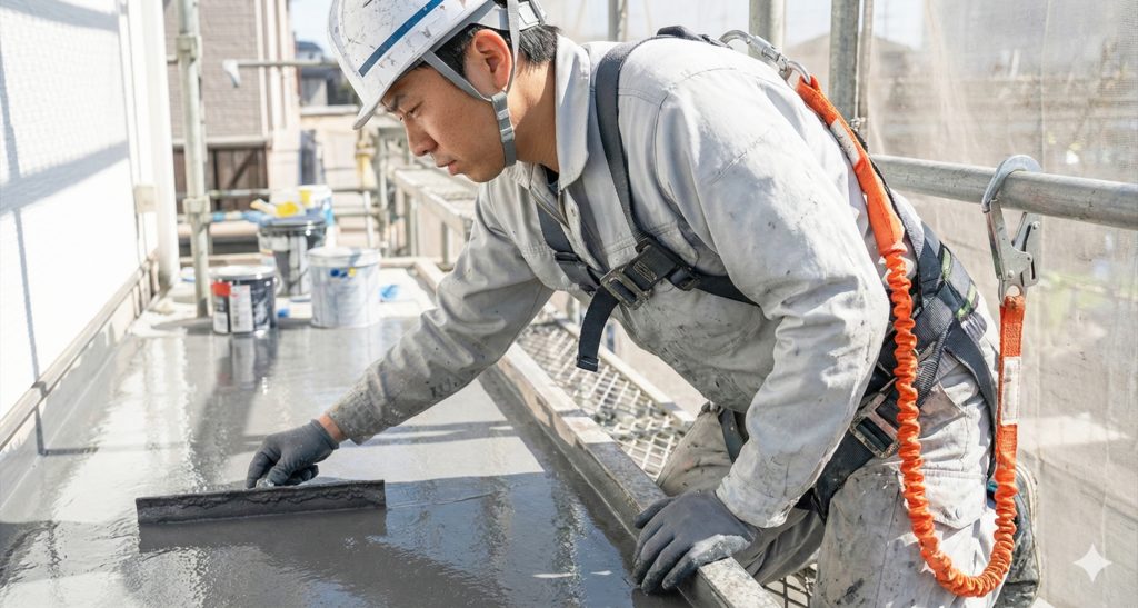 防水塗装は、ベランダや屋上などからの雨水の侵入を防ぐ工事です。水漏れや下地の腐食を防ぎ、建物を長く安全に使用するために重要です。